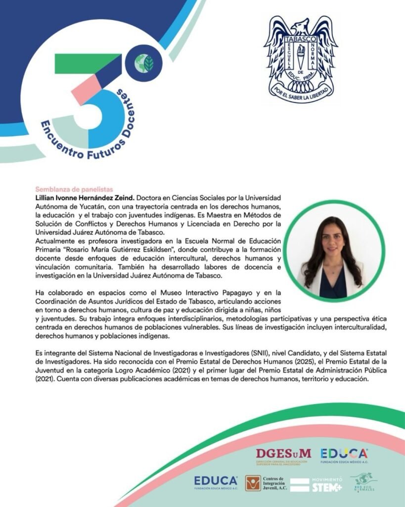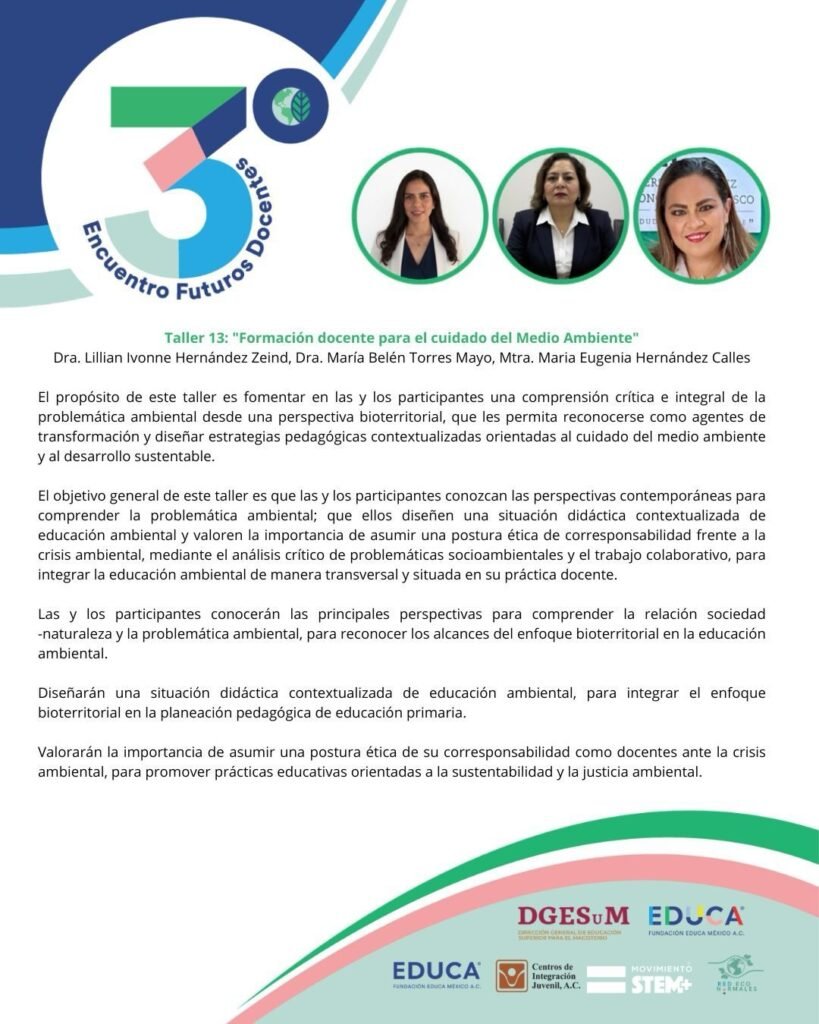 La actividad es impartida por la Dra. María Belén Torres Mayo, la Dra. Lillian Ivonne Hernández Zeind y la Mtra. María Eugenia Hernández Calles, quienes comparten su experiencia para fortalecer una educación ambiental crítica y situada.